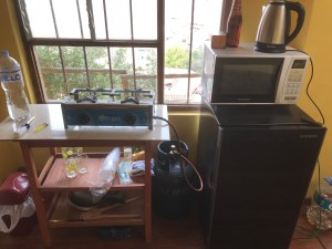 On voit la sorte de cuisine ici. Même qu’une grosse tarentule tenait compagnie au fourneau ce soir là. Comme pour nous souhaiter la bienvenue! (On trouvait ça bien drôle mais on capotait un peu aussi). Ils nous ont répondu que c’était une bonne chose que la tarentule soit là, pour manger les autres bibittes … (!)