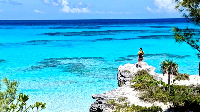 on trouve un spot de snorkeling près des roches à droite et on y voit une raie , une autre tortue et pleins de poissons tropicaux et des conchs (mollusque typique des Bahamas).